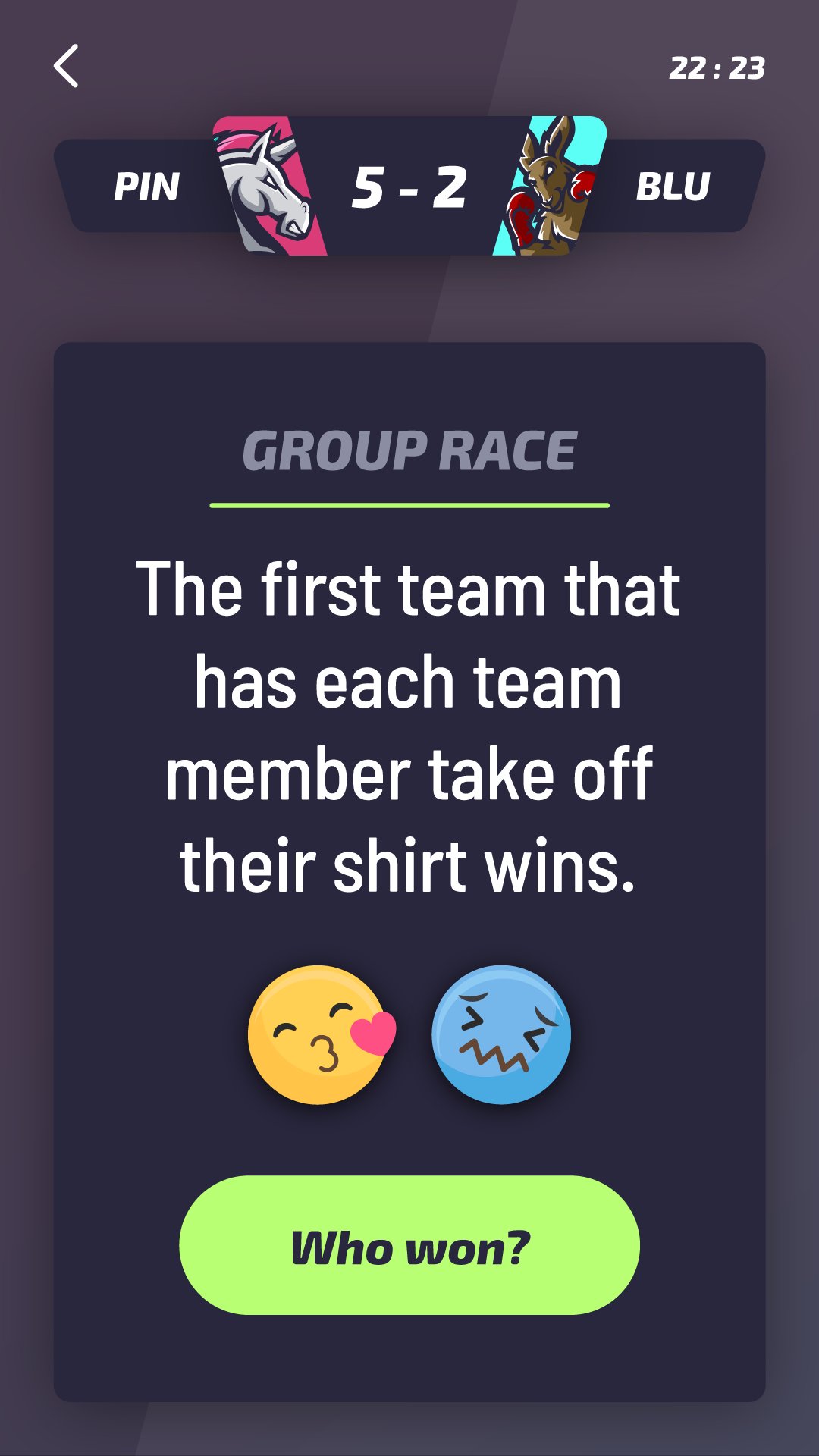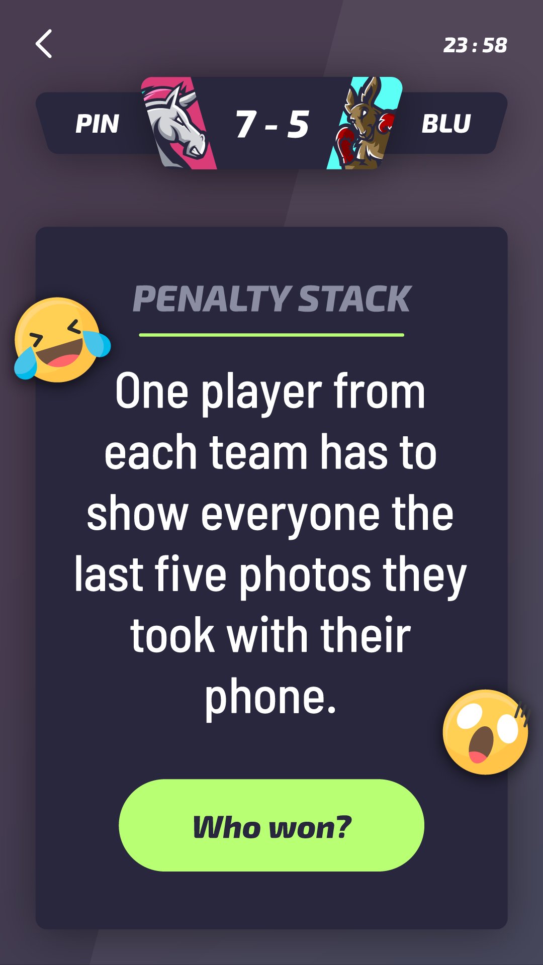 팀은 실제 스포츠처럼 다양한 도전과 게임에서 경쟁합니다. 패자는 페널티샷을 마셔야 하고, 승자는 음주 챔피언이 됩니다.