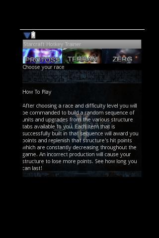 핫키를 기억하는 가장 좋은 방법은 핫키를 누르는 것입니다. 이 응용 프로그램은 실제 스타 크래프트 게임에서 유닛 제작을 시뮬레이션하는 다양한 구조 탭에서 구축 할 임의의 항목을 제시함으로써 당신의 지식을 테스트합니다! 이 앱은 새로운 레이스를 배우거나 게임을 처음 접했지만 프로토스 그라운드 무기의 핫키가 'G'라는 것을 기억하기 위해 고군분투하고 있다면 좋습니다.