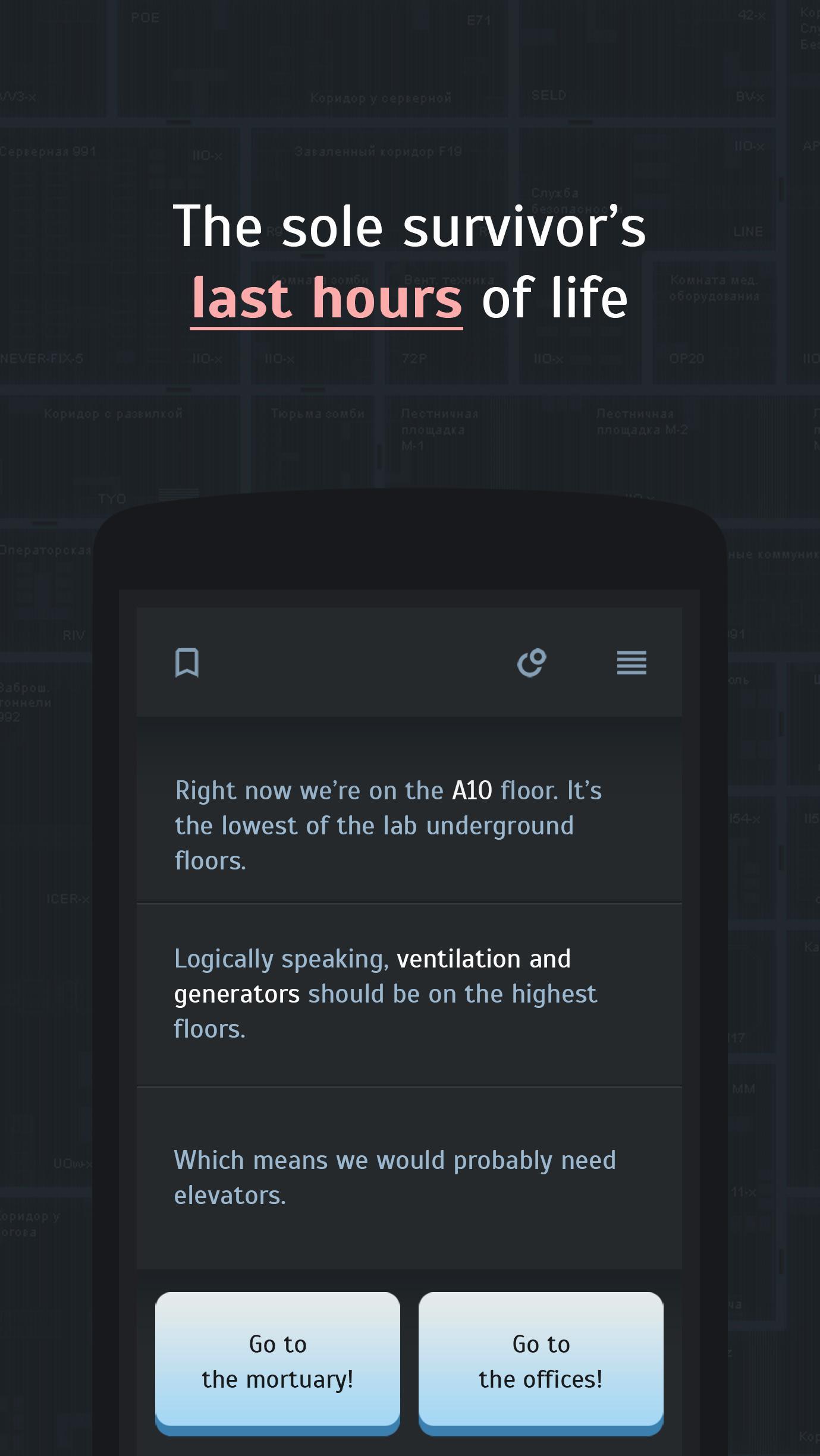 이야기 . 최고급 실험실 단지에서 신비한 사고의 유일한 생존자의 마지막 36 시간. 모든 사람에 의해 버려지고 절망적 인, 워킹 데드 사이를 방황하고, 기적에 의해 그가 당신에게 연락을 취하고 도움을 요청합니다.
