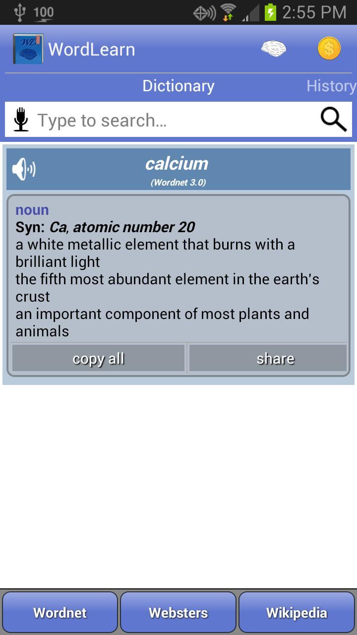* Pesquisas offline quase instantâneas nas fontes WordNet e Webster. (Algumas definições podem levar um pouco mais para renderizar visualizações personalizadas)