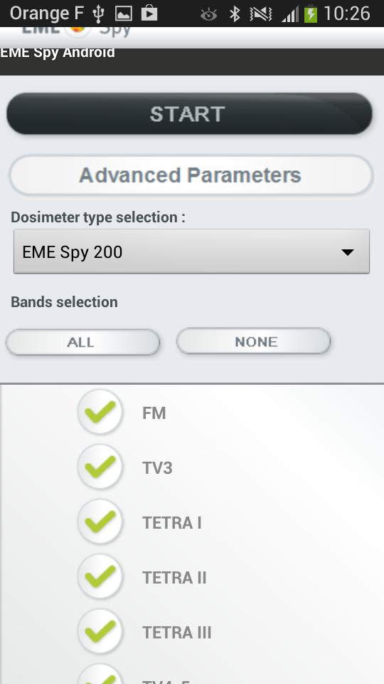 O aplicativo EME Spy Android permite visualizar medidas em tempo real feitas com o EME Spy: