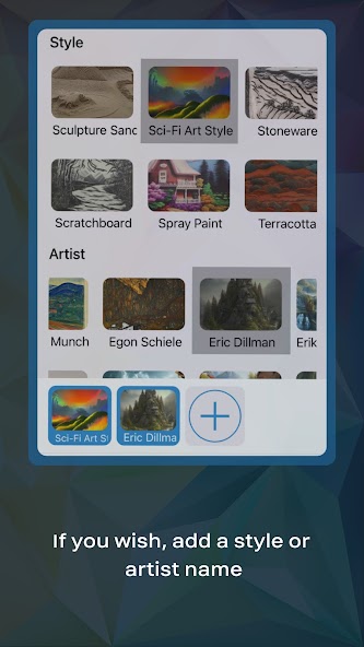 Você também pode adicionar o nome de um artista à sua criação. ImagAIne apresentará a imagem no estilo particular daquele artista. Se você quiser, você pode combinar estilos e nome do artista.