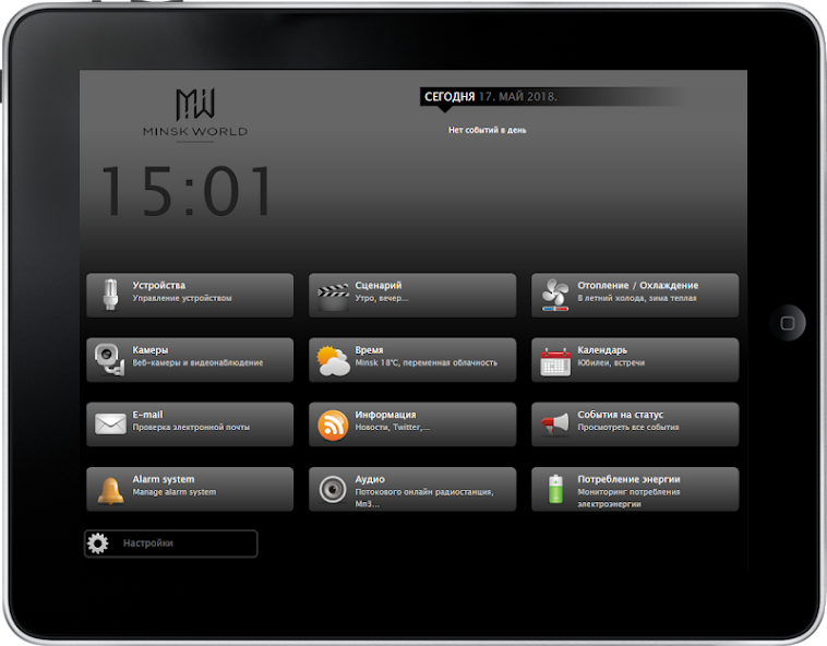 Minsk World é um software destinado a computadores domésticos, telas de toque e dispositivos remotos dedicados ao controle central de aparelhos, comunicação, segurança nas instalações domésticas e de negócios e muito mais.