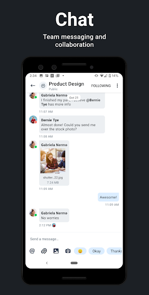 Verifique o status da presença e envie mensagens, compartilhe arquivos e colegas @MENTION em 1: 1, salas de bate -papo privadas ou públicas