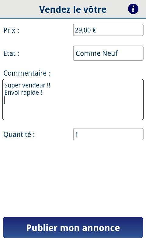 Ao examinar o código de barras do seu item com a câmera do seu telefone, você acessará diretamente a folha de produtos correspondente. Você pode vender rapidamente seu produto, simplesmente indicando seu preço e sua condição.