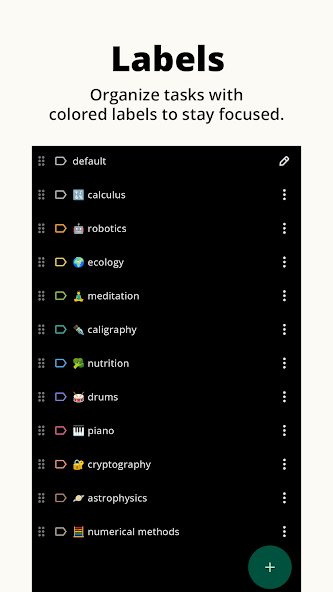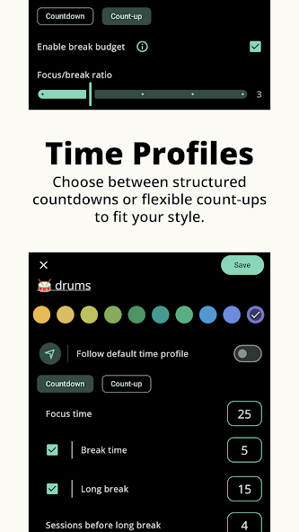Organize tarefas com rótulos coloridos e perfis de tempo personalizados para permanecer no caminho certo.