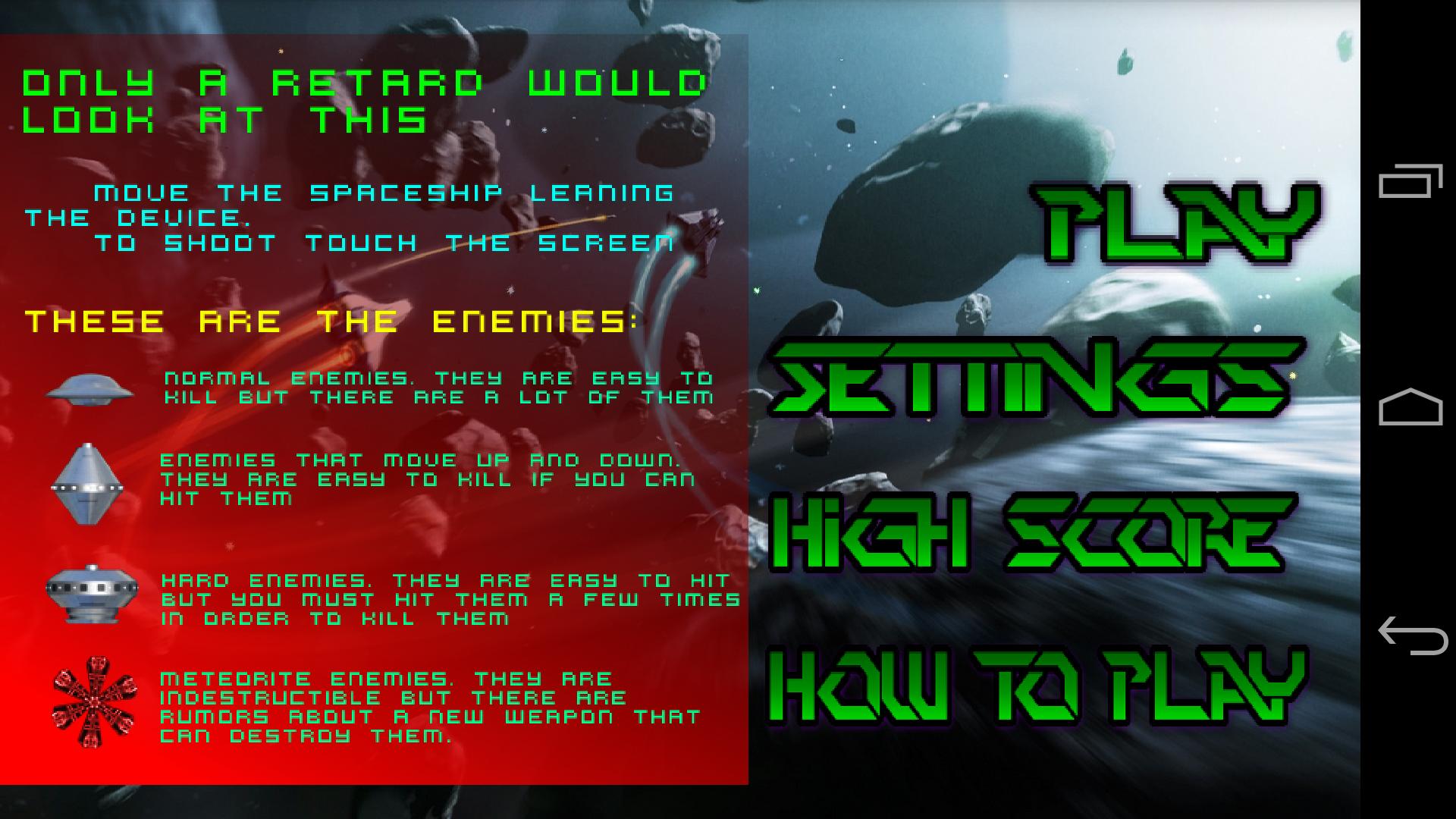 Comece uma jornada pelo espaço, percorrendo as naves espaciais inimigas que você terá que destruir. Durante a jornada, você encontrará energia que o ajudará a obter uma pontuação melhor.