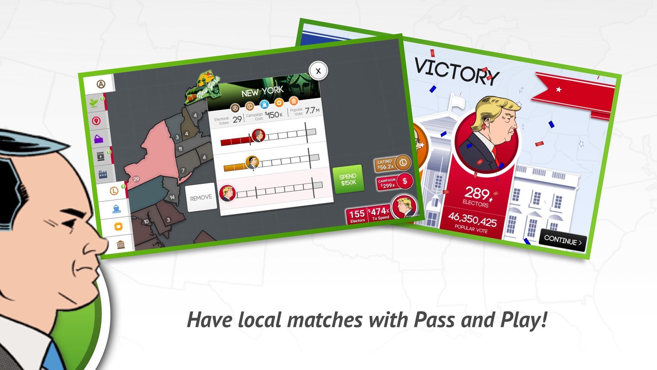 Então, lute contra a estrada para a Casa Branca, correndo contra oponentes políticos nos estados -chave, conquistando grupos de juros e acumulando votos eleitorais para se tornar presidente!