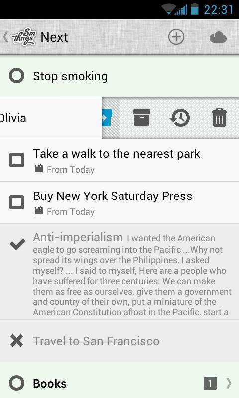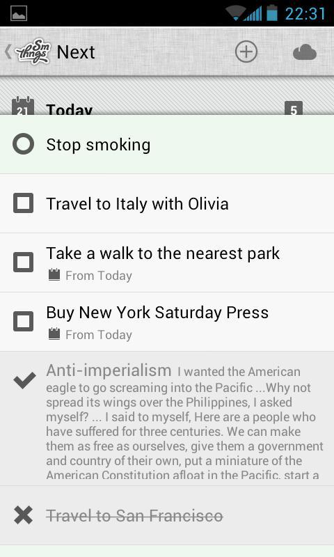 Smthngs - лучший способ добавить, организовать и делиться своими задачами на вашем смартфоне Android. Это основано на методах классического получения вещей (GTD), которые были улучшены и переосмыслили.