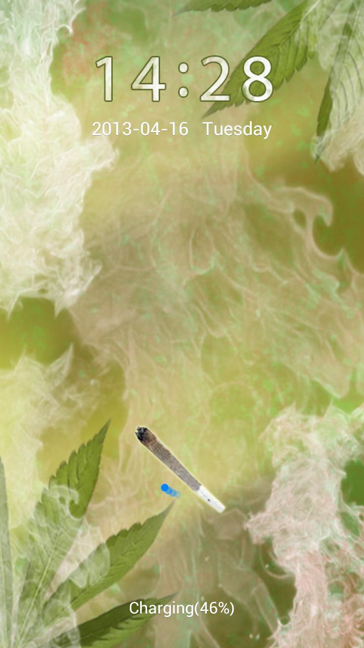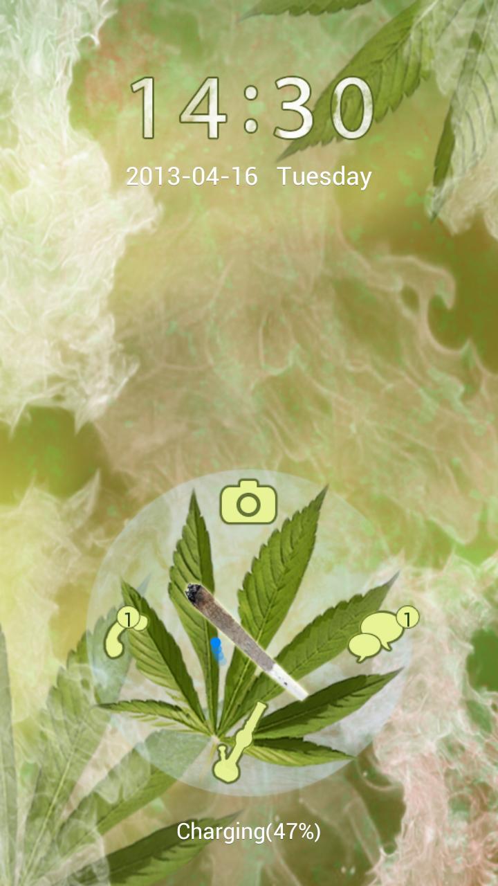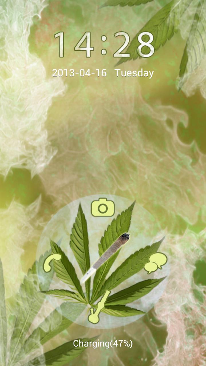 Заблокируйте свой телефон мотивом марихуаны. Что-то для поклонников известных сорняков. Замок обоев имеет оттенки зеленого, листового ганджи и много дыма. Аккумулятор сжигает тупой, что показывает количество заряда телефона с горящей травой. Замок была заменена листом Ganja, основные применения для блокировки - желтый, одна из икон Bongo. Время заполнено белым дымом. Дата белая.