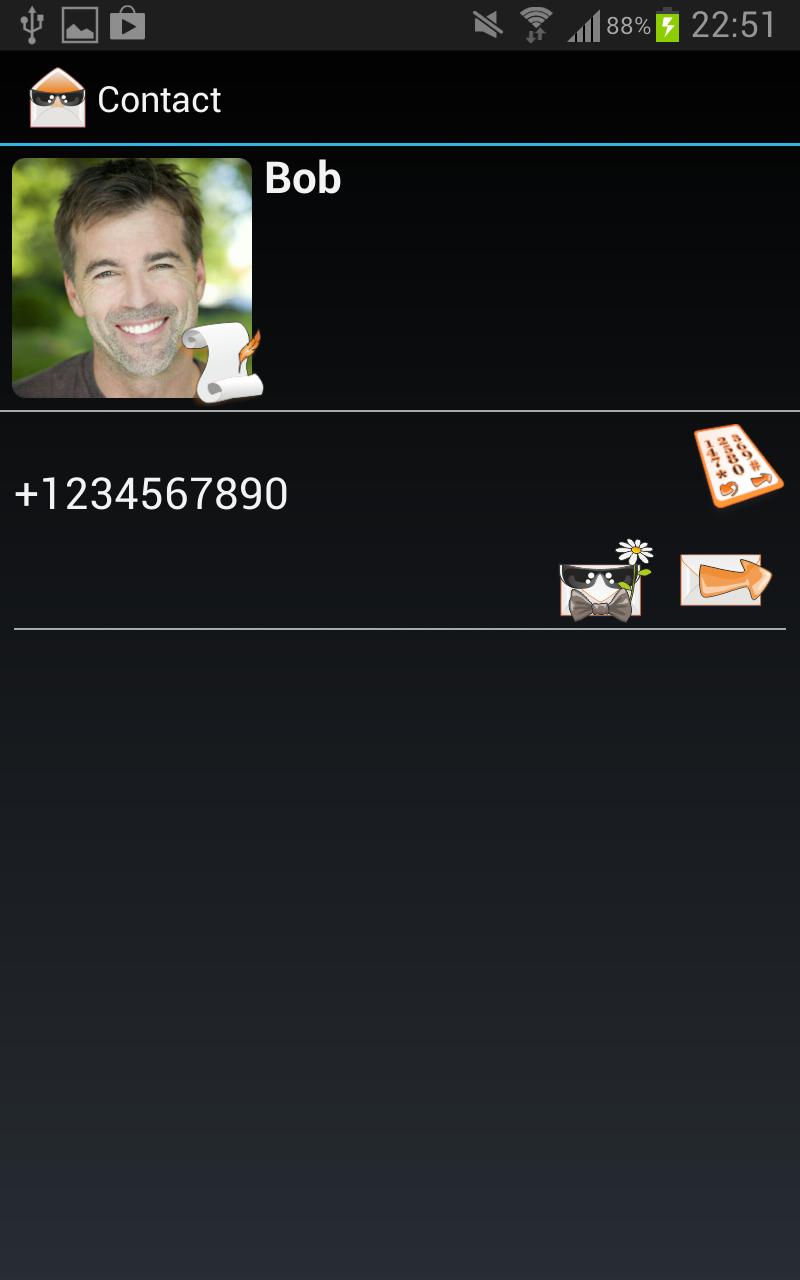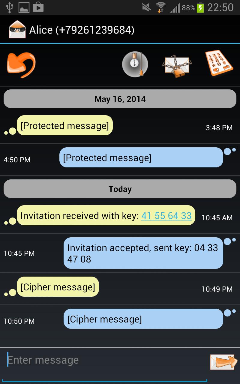 С темными SMS вы можете установить секретный разговор с кем угодно. Ваши сообщения будут зашифрованы с использованием трещин и современных алгоритмов шифра и обмена ключами.