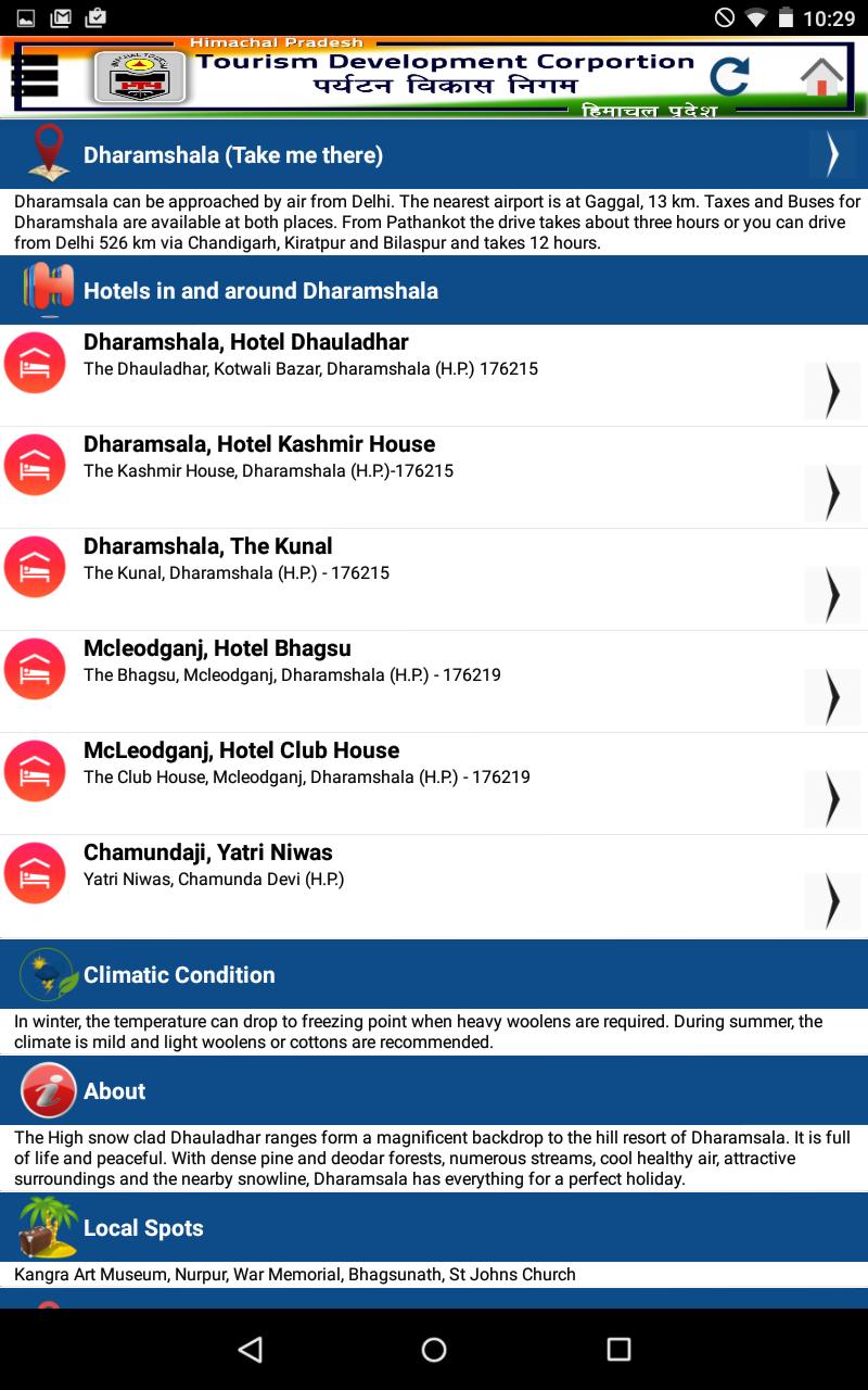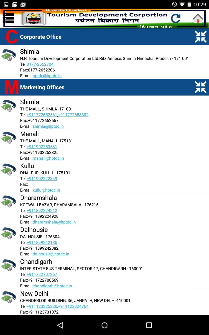 Приложение HPTDC предоставляет всю информацию о HPTDC , как доступно по адресу http://hptdc.nic.in в автономном режиме. Он охватывает, туристические места, отели, приключенческие виды спорта, конференции, как добраться до Химачала, фотогалерея, контактную информацию о бронировании офисов, помимо варианта бронирования отелей и автобусов. Доступна информация, связанная с каждым отелем, включая фотографии, номера номеров, тариф и доступность. В целях доступности Интернет требуется, в противном случае вся информация доступна в приложении.