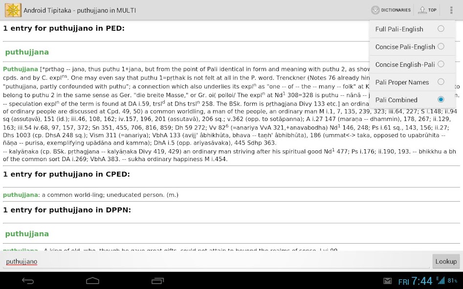 Tipitaka для Android-это приложение для чтения буддийской пали-пали Thuravada Pali Tipitaka , комментариев и суб-создателей в Пали. Он подходит для продвинутых студентов языка пали, поскольку он не включает переводы на английский язык. У него есть несколько палианговых словарей.