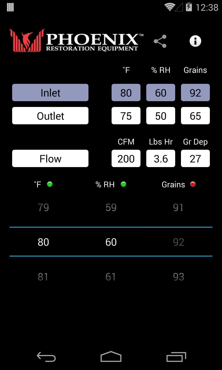 Приложение Phoenix Psychrometric Calculator обеспечивает быстрый и простой доступ к таким расчетам, как точка росы, зерна на фунт и производительность осушителя. Просто вращайте колеса, чтобы ввести температуру и относительную влажность. Приложение выведет соответствующую точку росы или зерна за фунт, давая вам информацию, необходимое для эффективного отслеживания вашей работы. Кроме того, вы можете использовать функцию производительности осушителя для вычисления удаления воды, выбрав CFM вашего осушителя и введя его впуск и условия выхлопных газов. Phoenix Psychrometric помещает все необходимые вам расчеты на ладони. Приложение Phoenix Psychrometric Calculator приносит вам оборудование для реставрации Phoenix, лидером индустрии реставрации в области эффективности, эффективности и надежности.