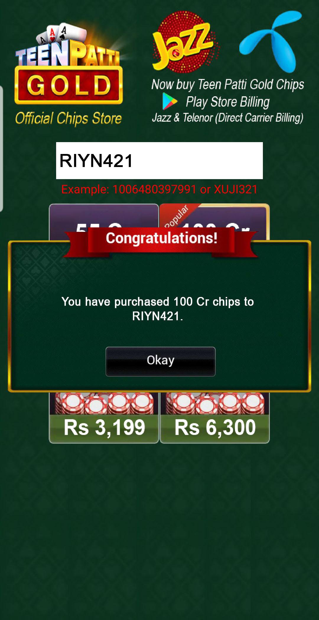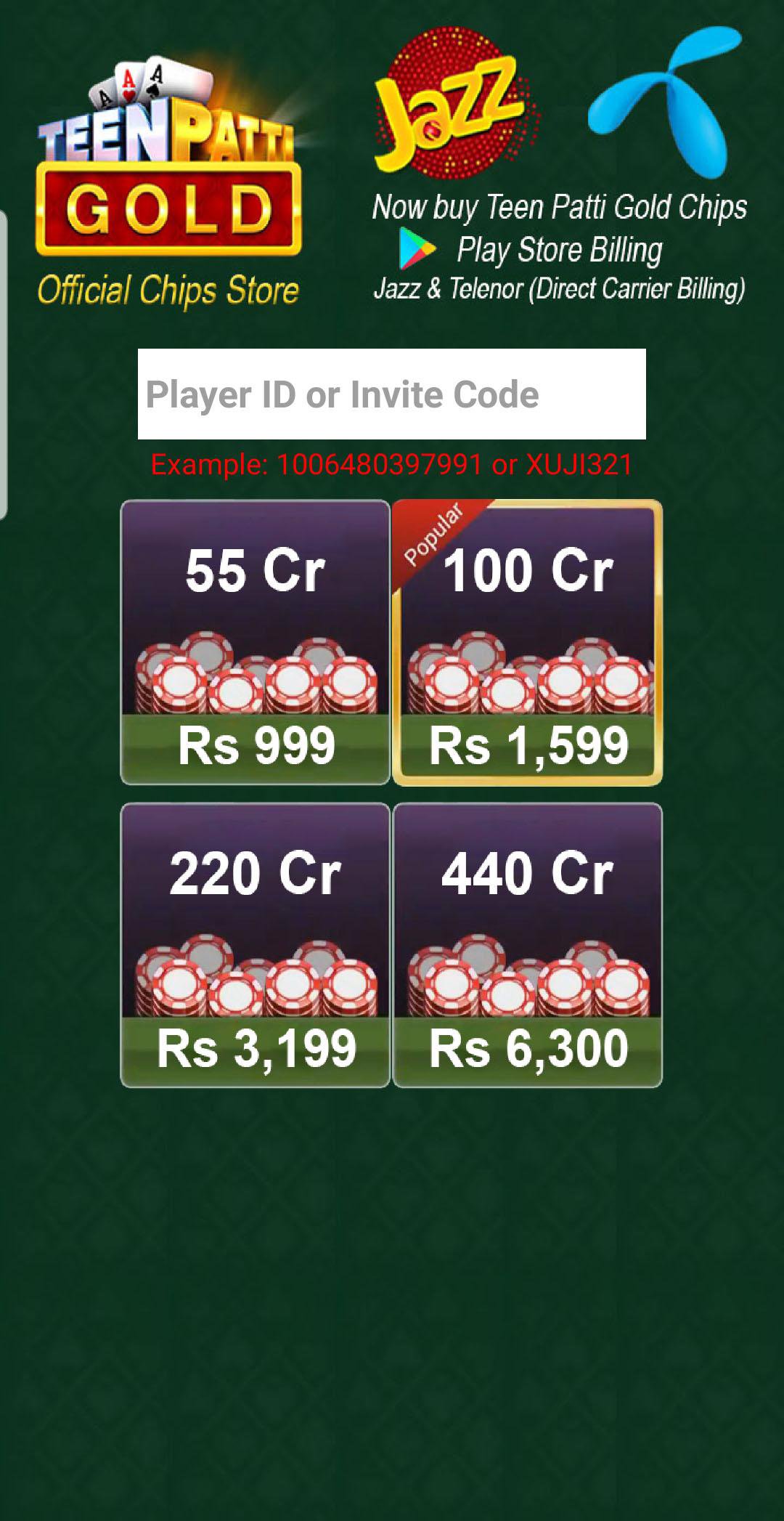Теперь покупайте официальные фишки Teen Patti Gold по очень низкой цене, используя биллинг Google Play, а также прямой биллинг оператора связи по всему миру. Также в Пакистане вы можете использовать свой мобильный баланс Jazz & Telenor. Все поддерживаемые сети по всему миру.