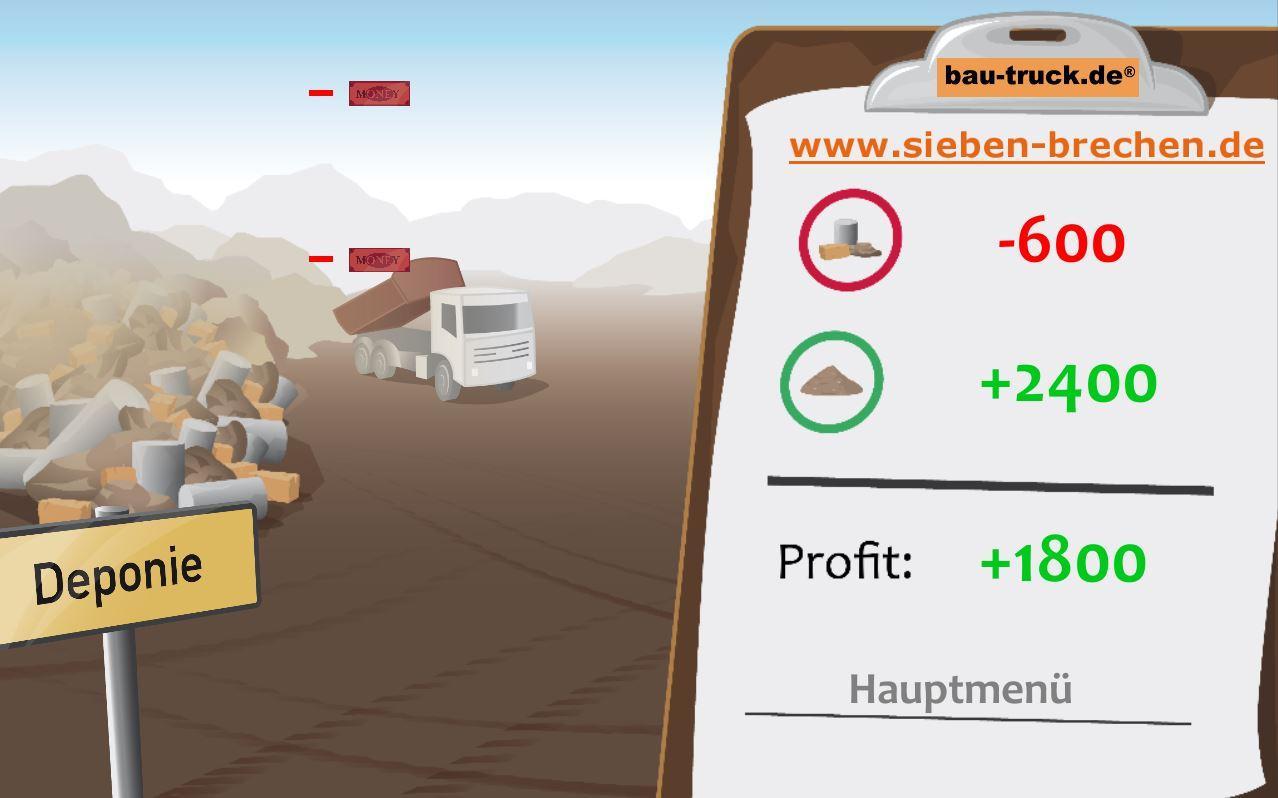 Der Bauschutt muss zielgenau in den Brecher geworfen werden. Die Steine die neben den Brecher fallen kommen auf die Deponie und ergeben negative Dollar. Alle Steine die richtig in den Brecher geworfen wurden, können wieder verwertet werden und bringen virtuell positive Dollar.