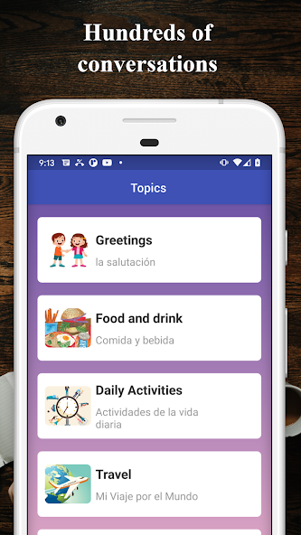 แอพการสนทนาคำศัพท์ภาษาเกาหลีประกอบด้วยการสนทนาภาษาเกาหลีกว่า 100 รายการซึ่งครอบคลุมการสนทนาภาษาเกาหลีที่ใช้มากที่สุดจาก 9 หมวดหมู่: