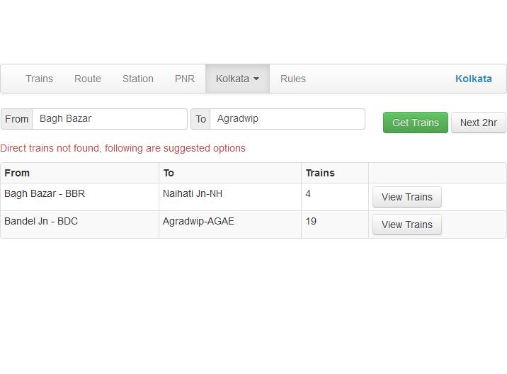 แอป Kolkata Local Train (Metro) ให้ข้อมูลเกี่ยวกับบริการรถไฟชานเมืองของกัลกัตตา/รถไฟท้องถิ่นที่วิ่งระหว่างสถานีรถไฟสองแห่งในหรือหลังจากเวลาที่กำหนดของวันผู้สอนสามารถค้นหาบริการรถไฟระหว่างสองสถานีใด ๆ ที่อยู่บนเส้นทางโดยตรงเดียวกัน