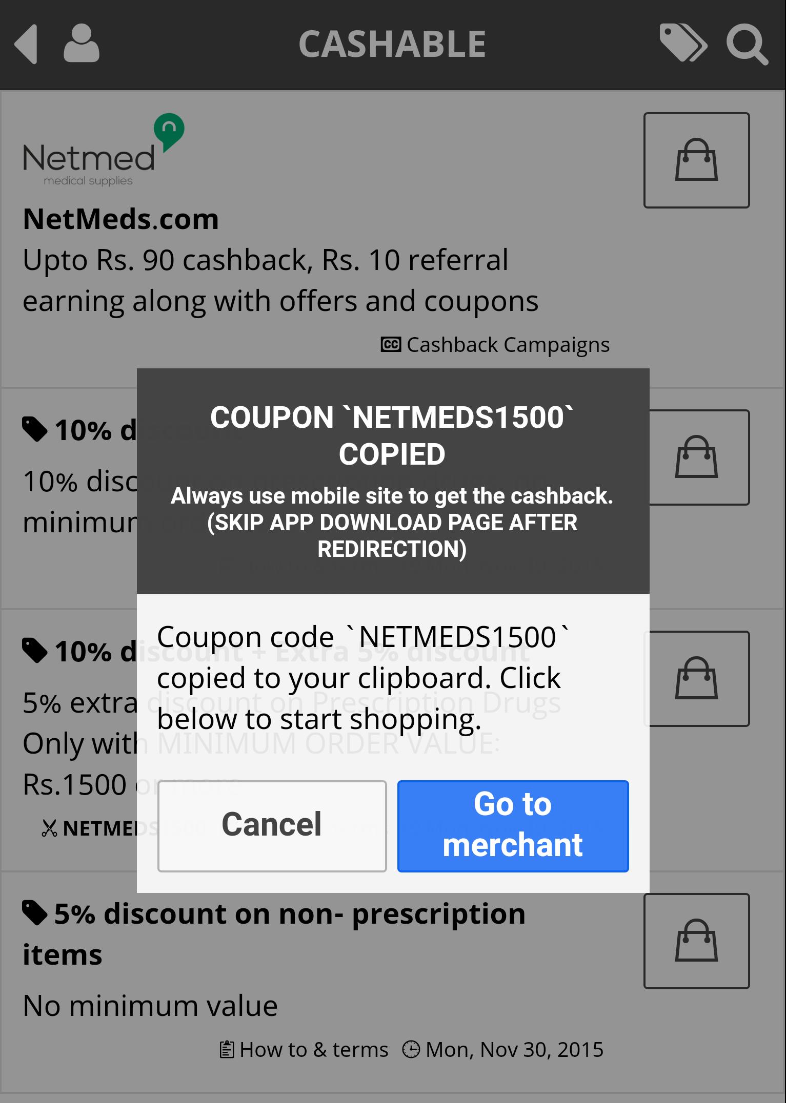 2. ไปที่ผู้ค้า (เช่น: flipkart/amazon/snapdeal ฯลฯ ) ผ่าน CASHABLE