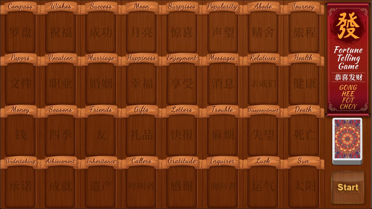 ค้นหาสิ่งที่โชคชะตาสำรองสำหรับคุณเล่น Fortune-Telling Game ที่ใช้มาจาก "The Greetings of Riches" (Gong Hee Fot Choy) ซึ่งเป็นระบบการทำนายที่พัฒนาโดย Mystic และ Margaret Ward ที่มีชื่อเสียงและนักเดินทางในยุค 30