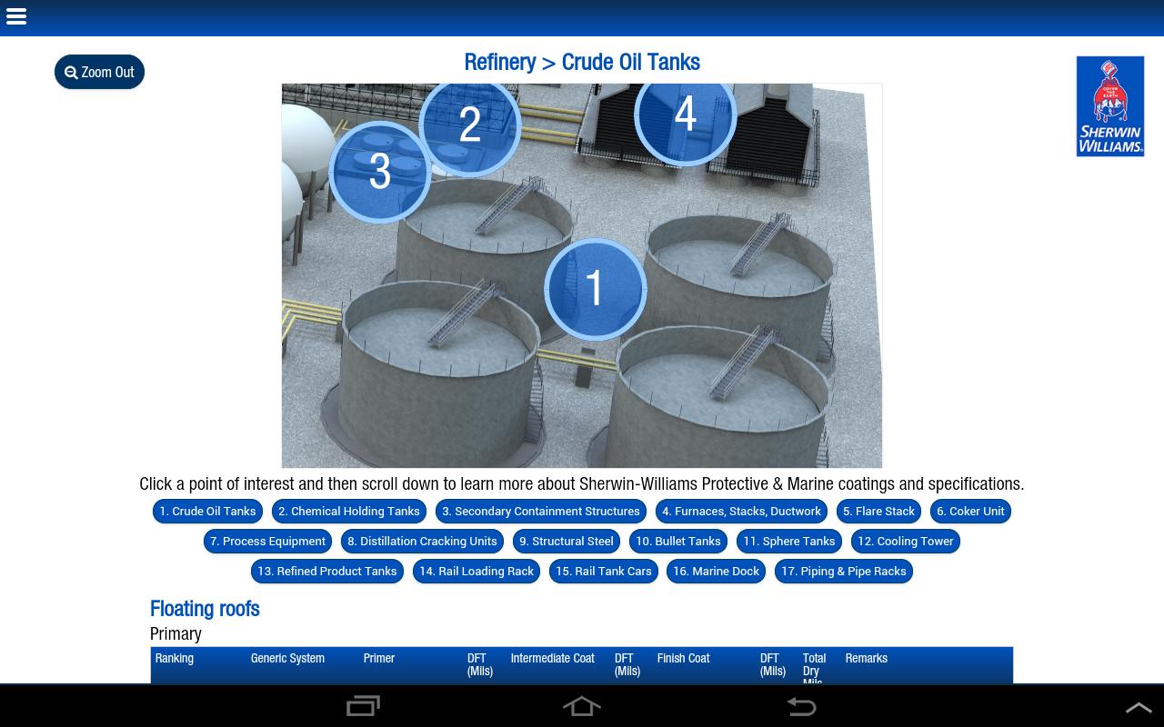 石油和天然气使您可以探索炼油厂或页岩钻探地点的每个区域的最佳Sherwin-Williams涂层。从坦克到管道,冷却塔到铁路坦克汽车,Sherwin-Williams都需要覆盖您的涂料。借助设备各个方面的全面涂料规格,石油和天然气是互动,快速且易于使用的。只需触摸精确标记即可放大以获取详细信息,包括: