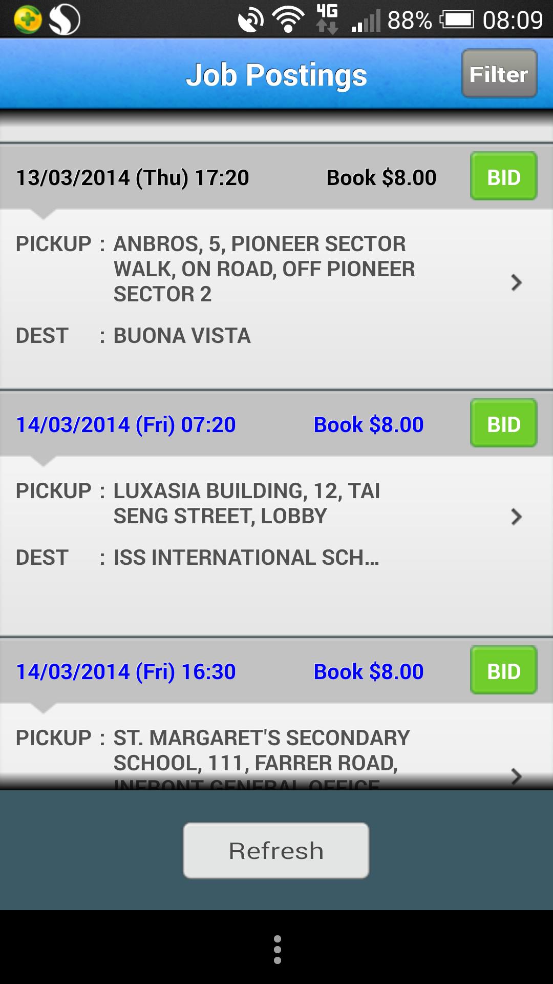 - 显示可用于竞标的预订工作列表,允许Cabby根据其首选日期,时间和接送点进行选择