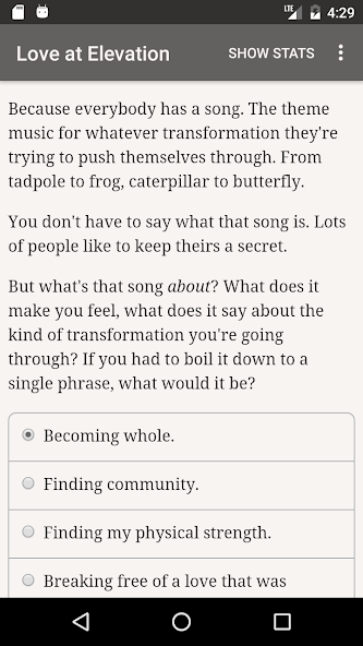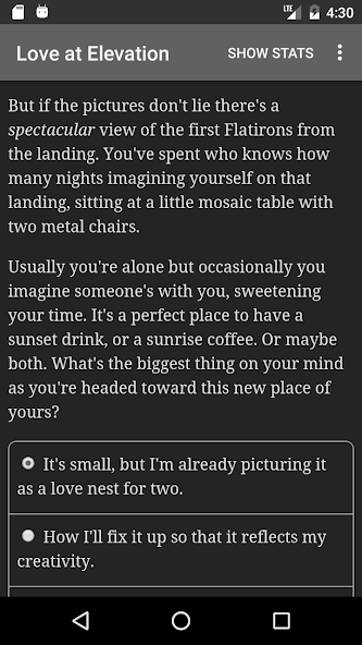 “ Love at Elevation ”是Steve Wingate的325,000字互动浪漫小说。它完全是基于文本的,没有图形或声音效果,并且在您的想象力的巨大,不可阻挡的力量中推动了它。