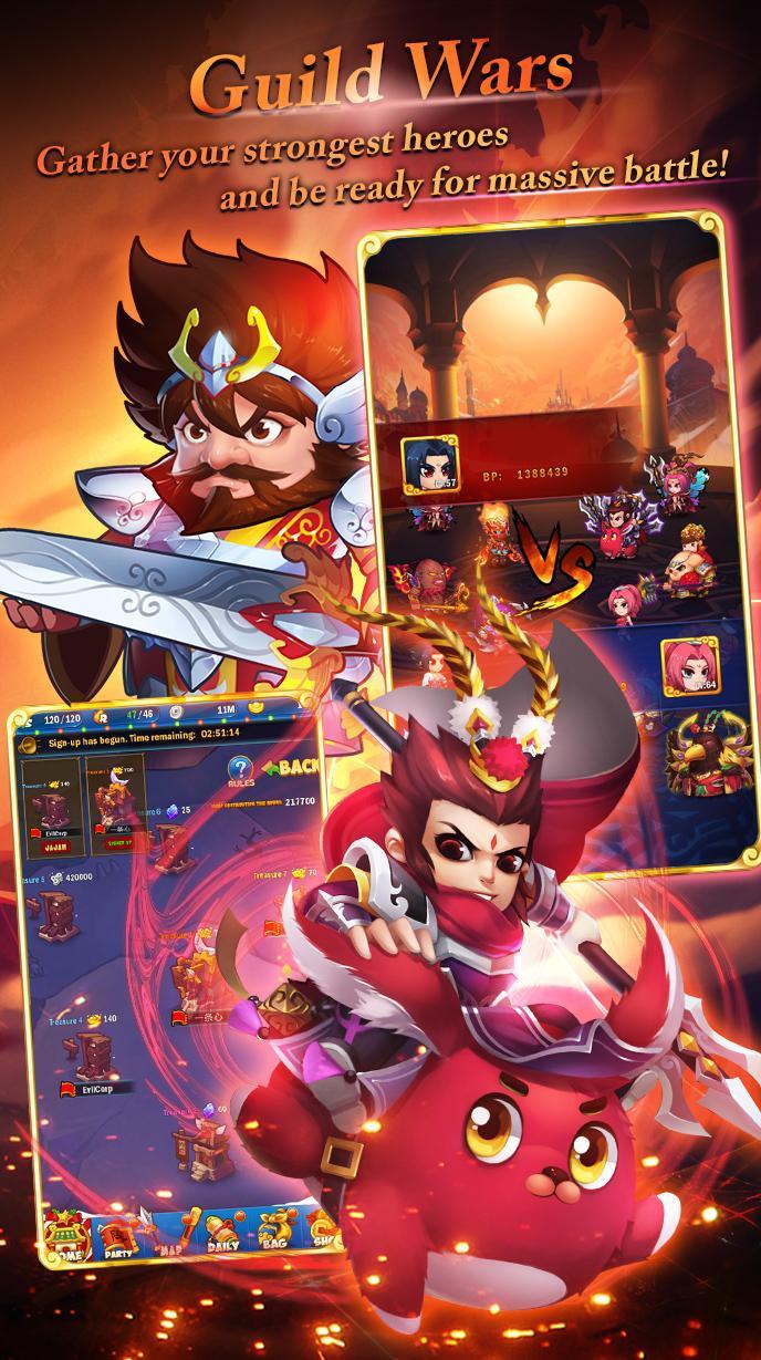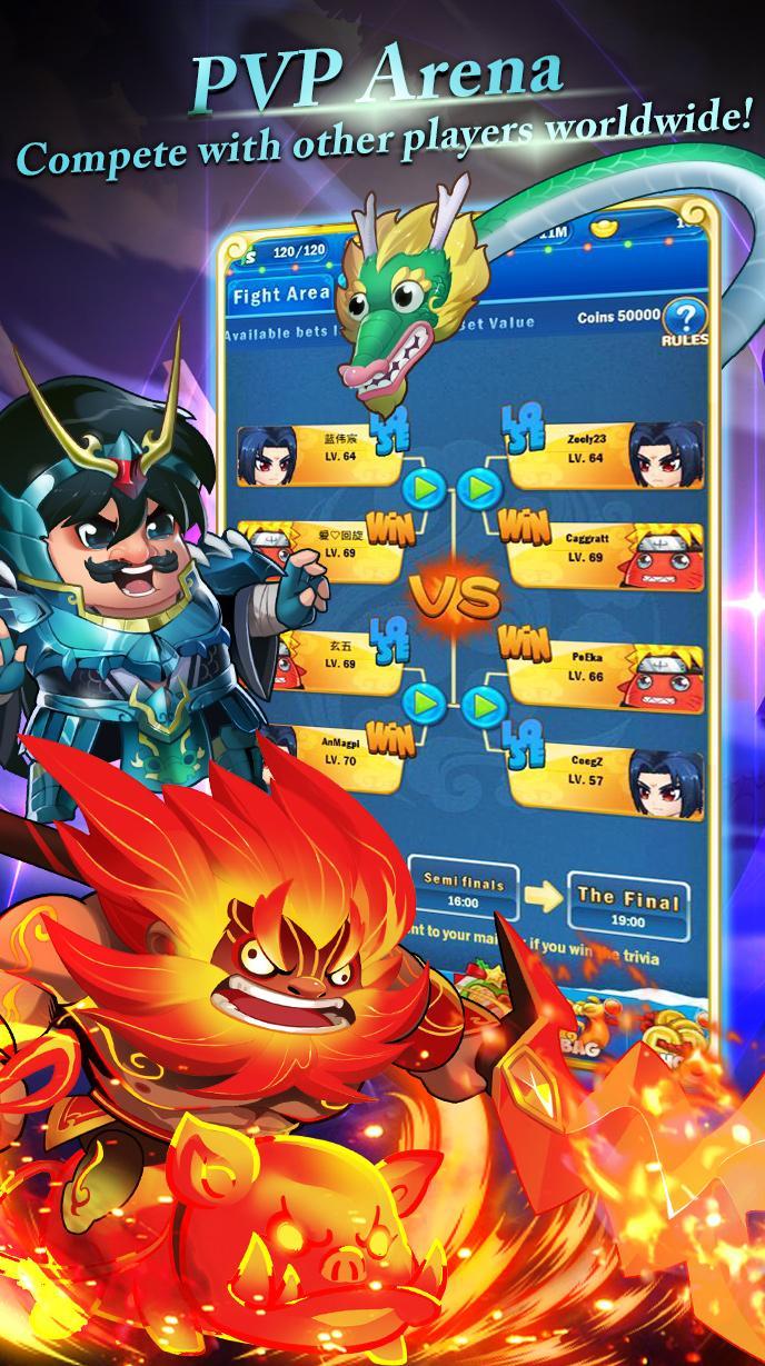 最令人兴奋的RPG策略,看见来自三个王国的最强大的将军:Yu,Lu Bu,Zhao Yun和Mighty Heroes从旅途到西方:Sun Wu Kong,Tong Samchong,Nazha。