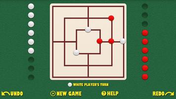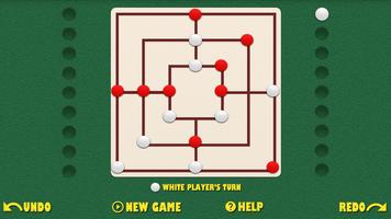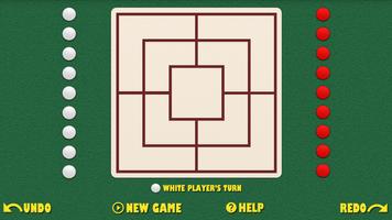 董事会由带有二十四个交叉点或点的网格组成。每个玩家都有九件。玩家试图形成“磨坊” - 水平或垂直排列的三个男人,使玩家从游戏中删除对手的作品。球员通过将对手减少到两片(他再也无法组成磨坊,因此无法获胜),或者将他离开他而没有法律行动而获胜。