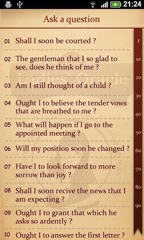 “我想的人,他爱我吗?” “我嫁给年轻吗?” “我爱的人,他忠于我吗?”女士们的甲骨文是一款聪明的小游戏,对任何提出的问题都没有令人满意的结果回答。