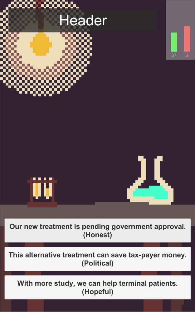 這款以選擇為驅動的短暫驅動的遊戲使您扮演著一名研究人員的角色,該研究人員努力從政府贈款中獲得資金。在每種情況下,您都必須為研究論文選擇標題,以引起適當的關注。但是,當這些標題變得誤導或令人難以置信的不誠實時,您會在哪裡劃清界限?